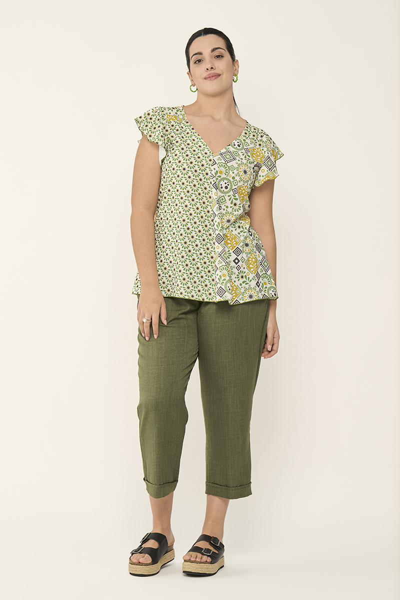 Combínala con pantalón recto o capri verde para un efecto estilizado y armónico. Si quieres alargar visualmente la silueta, añade sandalia en tono neutro o cuña media.