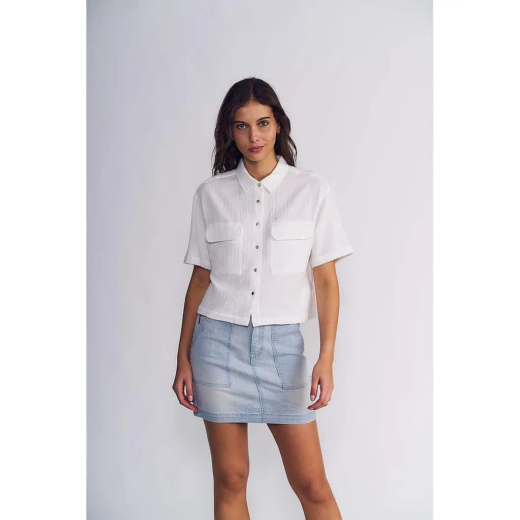 Cuenta con cuello clásico, cierre de botones frontales y dos bolsillos delanteros funcionales, que aportan un aire casual y práctico. Su corte recto y la caída natural de la tela la convierten en una opción perfecta para usar tanto con jeans, shorts o faldas, adaptándose fácilmente a looks casuales o más sofisticados.