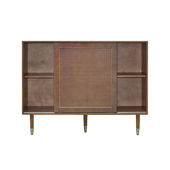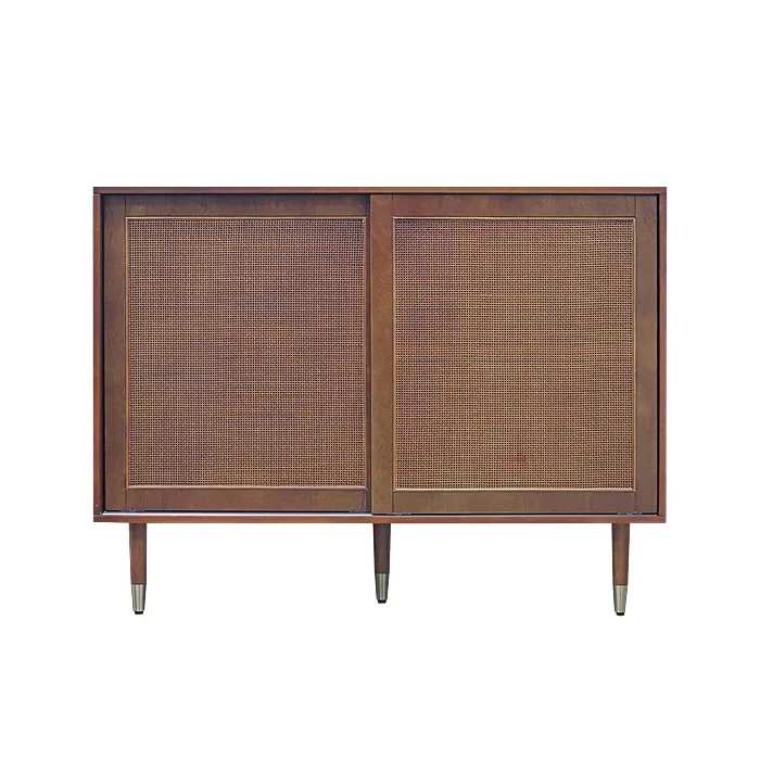 Buffet Enjuncado Walnut de estilo retro moderno. Elegancia y Funcionalidad. Este sofisticado buffet combina el encanto del diseño retro con la funcionalidad moderna, convirtiéndose en una pieza clave para cualquier ambiente contemporáneo o clásico. Fabricado en madera de alta calidad, destaca por sus puertas corredizas enjuncadas, que aportan textura visual y permiten una ventilación natural del interior. Sus patas cónicas elevadas, con terminaciones metálicas doradas, no solo brindan estabilidad, sino también un toque de distinción que realza su estética. Ideal para almacenar vajilla, utensilios o elementos decorativos, este buffet ofrece una solución práctica sin sacrificar estilo. El acabado en tonos cálidos de madera lo hace versátil y fácil de integrar en espacios como comedores, salas o recibidores, aportando calidez y orden con un diseño limpio y atemporal.