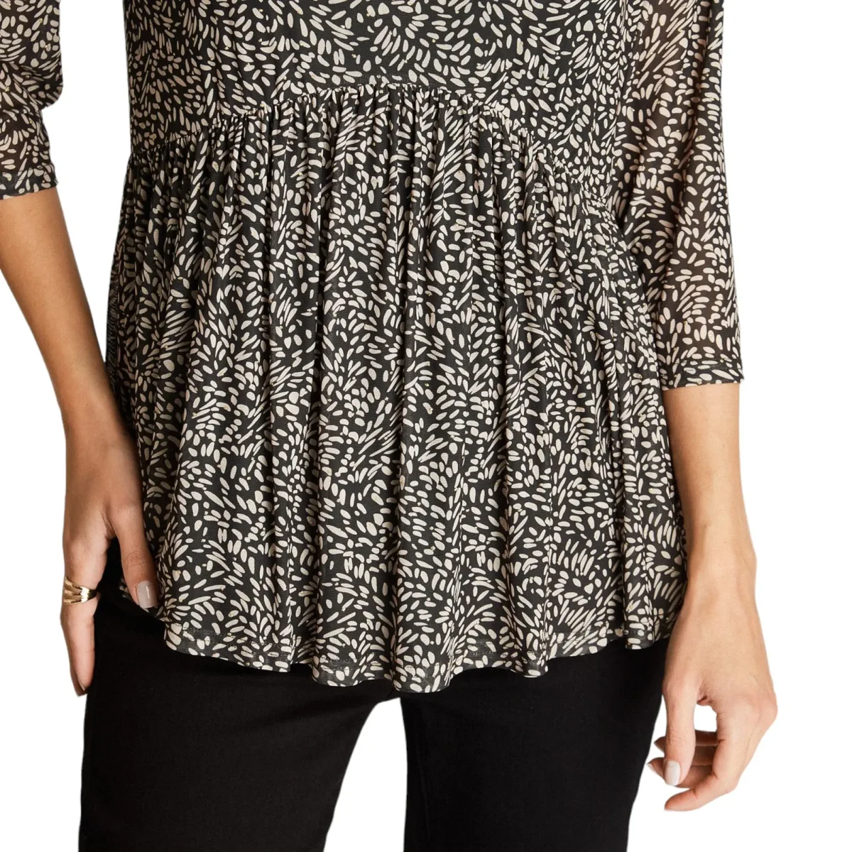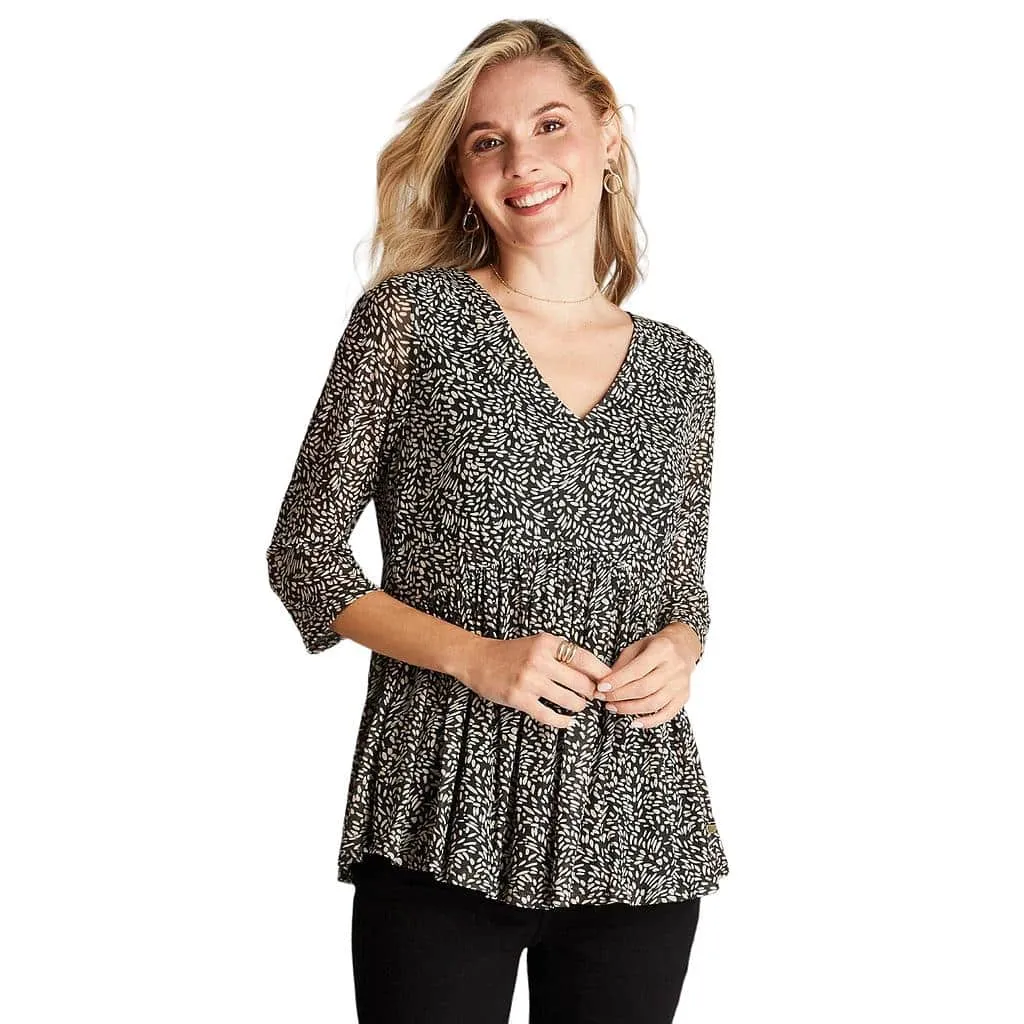 Polera Mesh estampada de manga 3/4 y cuello en V, con aplicación de lurex para un toque de brillo sutil. Disponible en elegantes tonos azul y negro, esta prenda añade un toque de estilo único a tu guardarropa. Confeccionada en una mezcla de 94% poliéster y 6% Elastano, ofrece comodidad y elasticidad. Perfecta para lucir un look sofisticado y moderno en cualquier ocasión. Curvi