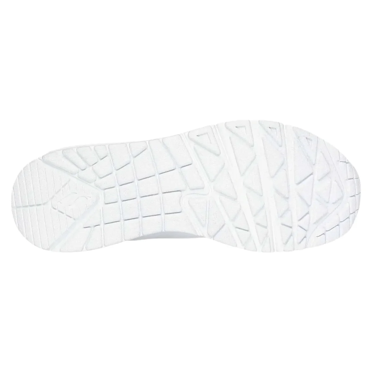 Luce un estilo clásico con comodidad usando Skechers Street® Uno – Shimmer Away. Esta zapatilla de moda presenta una parte superior de durabuck sintético con un ribete metálico, cordones elásticos, una plantilla Skechers Air-Cooled Memory Foam® y una entresuela con bolsa de aire visible Skech-Air®.